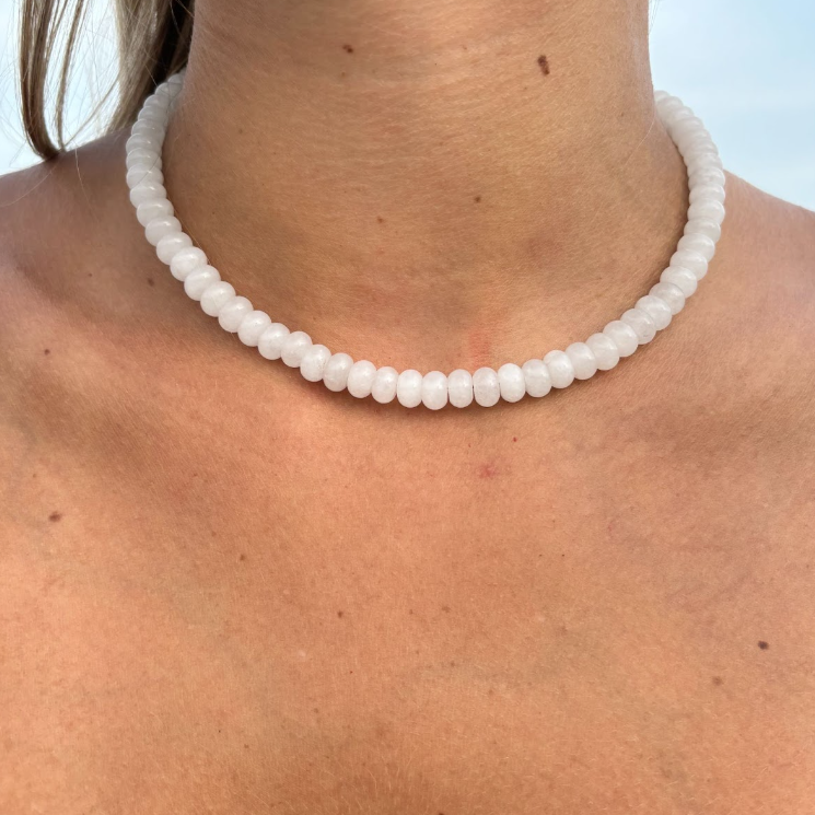 16 inch white jade rondelle with a gold filled lobster claw. The perfect addition to any stack!